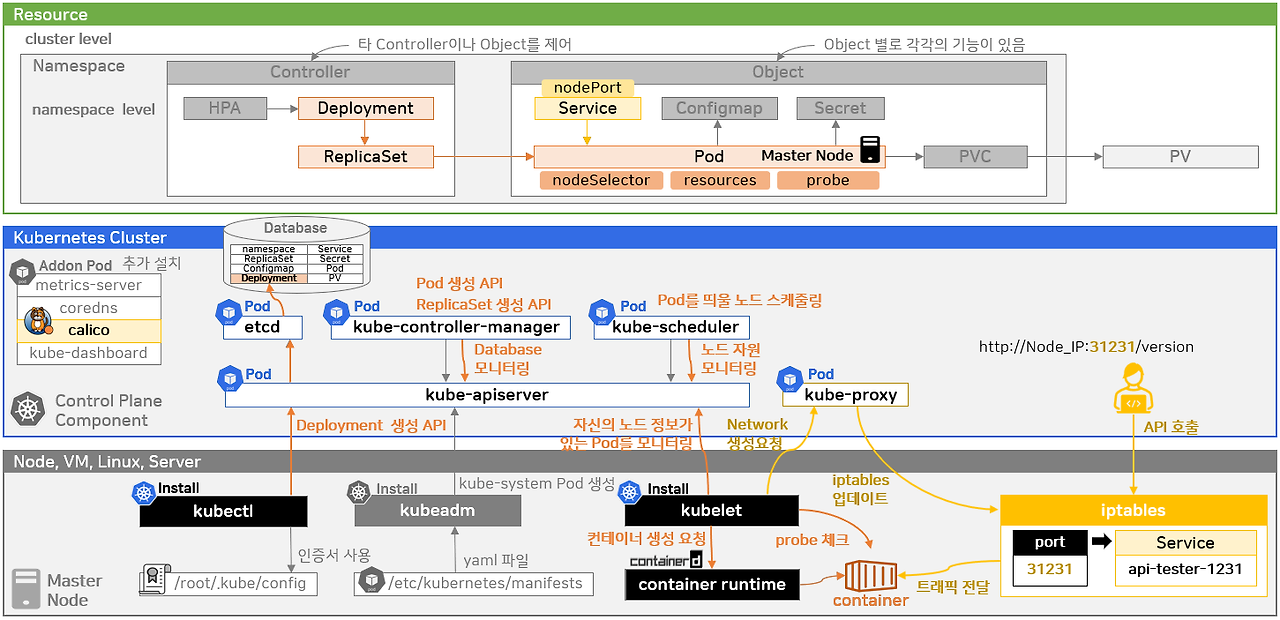 - kubelet -> kube-proxy -> iptables에 serivce와 port 설정 후, calico를 이용하여 container에 외부로부터의 트래픽 전달.
