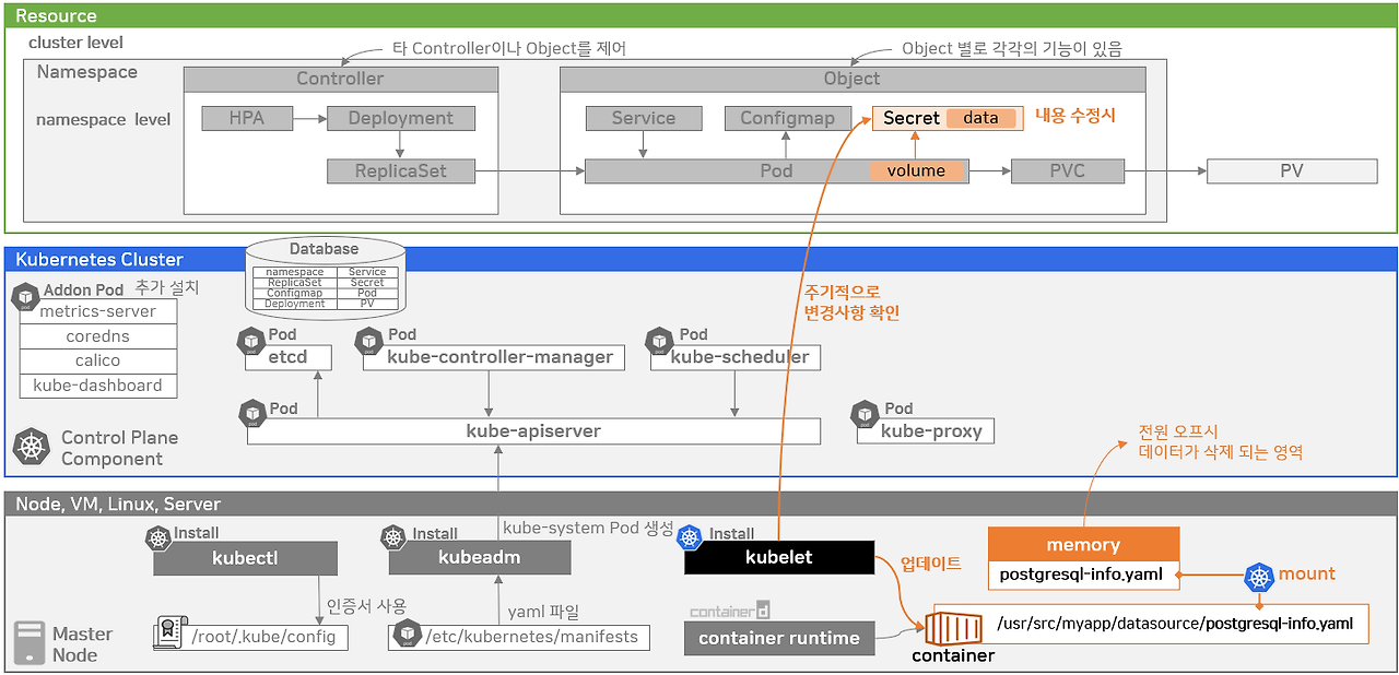 - kubelet이 secret을 생성 후 container에 마운트.