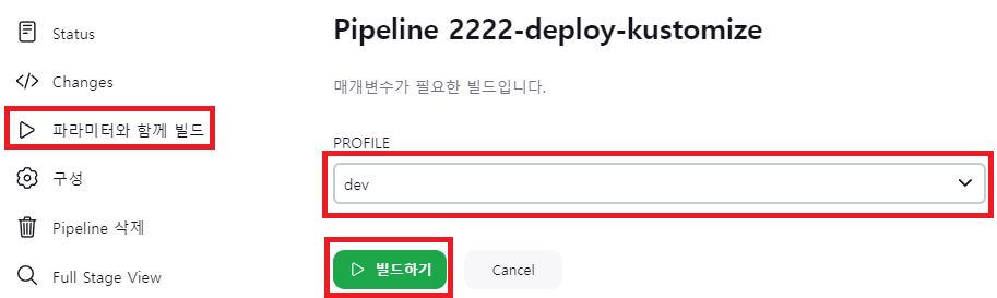- 파라미터와 함께 빌드 실행 후 PROFILE을 dev로 선택하고 빌드하기 클릭