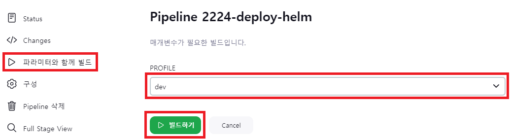 2. 파라미터와 함께 빌드 실행 후 PROFILE을 dev로 선택하고 빌드하기 클릭